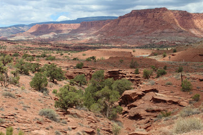 On Tuesday, we drove into Capitol Reef National Park. Apparently, Capitol Reef gets is name from a line of white domes and cliffs of Navajo Sandstone that look somewhat like the United States Capitol Building.We stopped several times at the pullouts along the side of the road before we even got to the visitor center and the start of the Scenic Drive through the Fruita area of the park. UT-24E runs through the park. Its about 7 miles from the Capitol Reef sign to the Visitor Center. These are a few of the many pictures I took during that 7 miles.